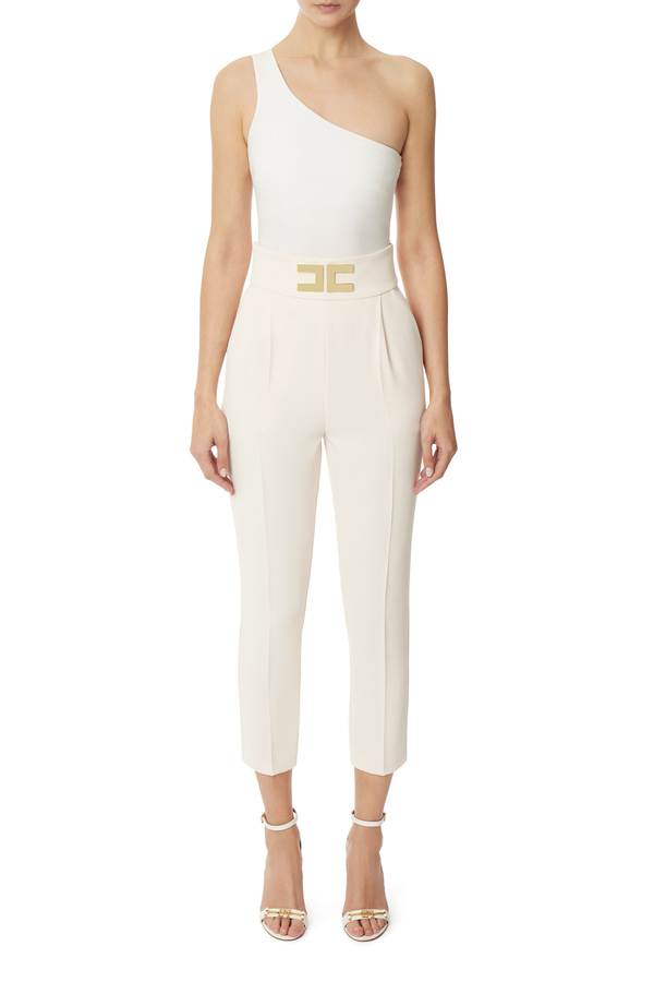 Straight pants in crêpe fabric with darts and split at the bottom. It features a waistband with golden metal logo plaque.